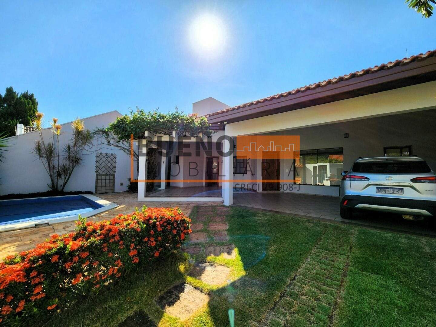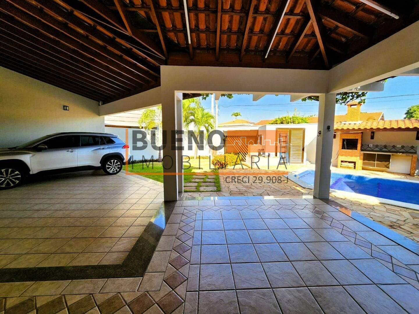 Área de lazer com piscina, churrasqueira, ducha e lindo jardim. Garagem para 6 carros, sendo 2 em parte coberta.